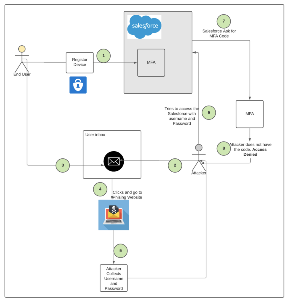 - Since the user has activated MFA, Salesforce sends a push notification to his cell phone asking to verify. Since the attacker does not have access to the cell phone, the user’s account is still secure.