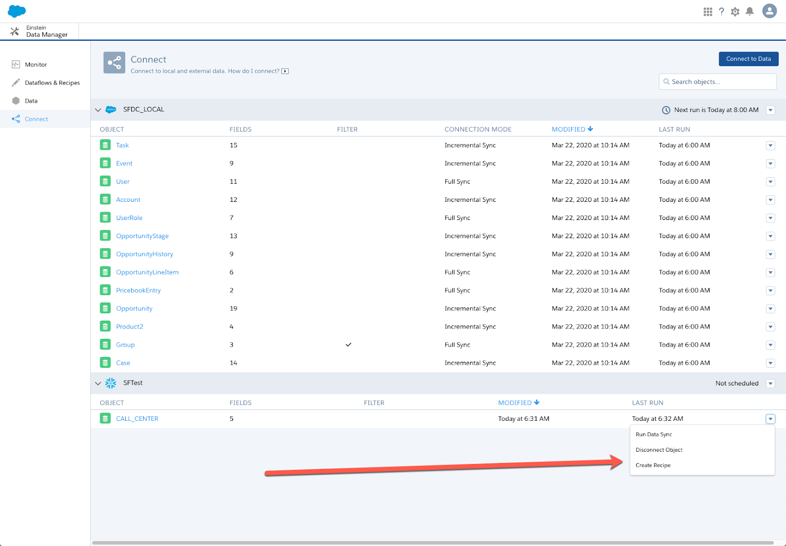 Once you’ve selected your fields, you can now create a dataset using a recipe. You’ll do this in the Connect menu of the Data Manager.