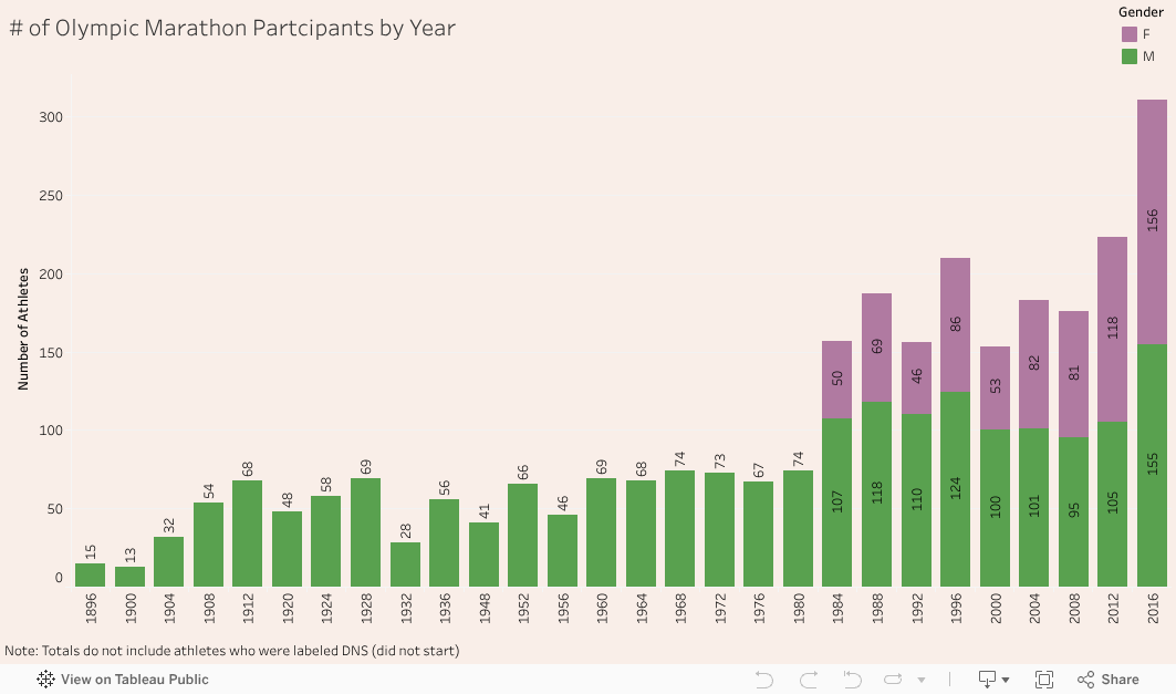 With the help of a few Tableau visualizations, this blog will highlight a few of these legendary Olympic Marathon achievements, whether it’s winning a gold medal while intoxicated, poisoned, and dehydrated (yes, all at the same time), or setting the world record running in bare feet. Every chart in this article is interactive, so feel free to click, tap, or mouse over any data point that interests you to learn more about it. Let’s jump right in.